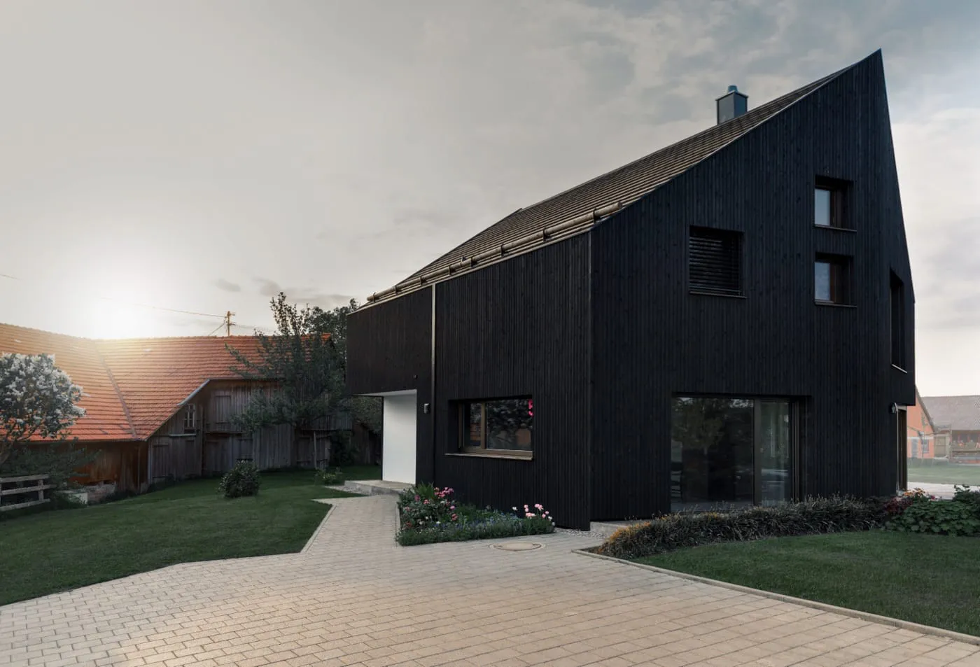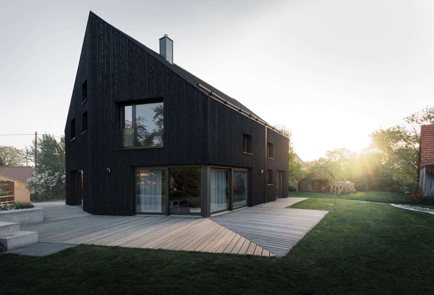 Die schwarz geölte Holzfassade greift die Optik der umliegenden Bauernhäuser auf und verdeckt technische Details wie Dachrinnen oder Fallrohre. Nur der weiß hervorgehobene Eingangsbereich unterbricht den homogenen Charakter des Hauses, das wie eine Skulptur in der Landschaft steht.