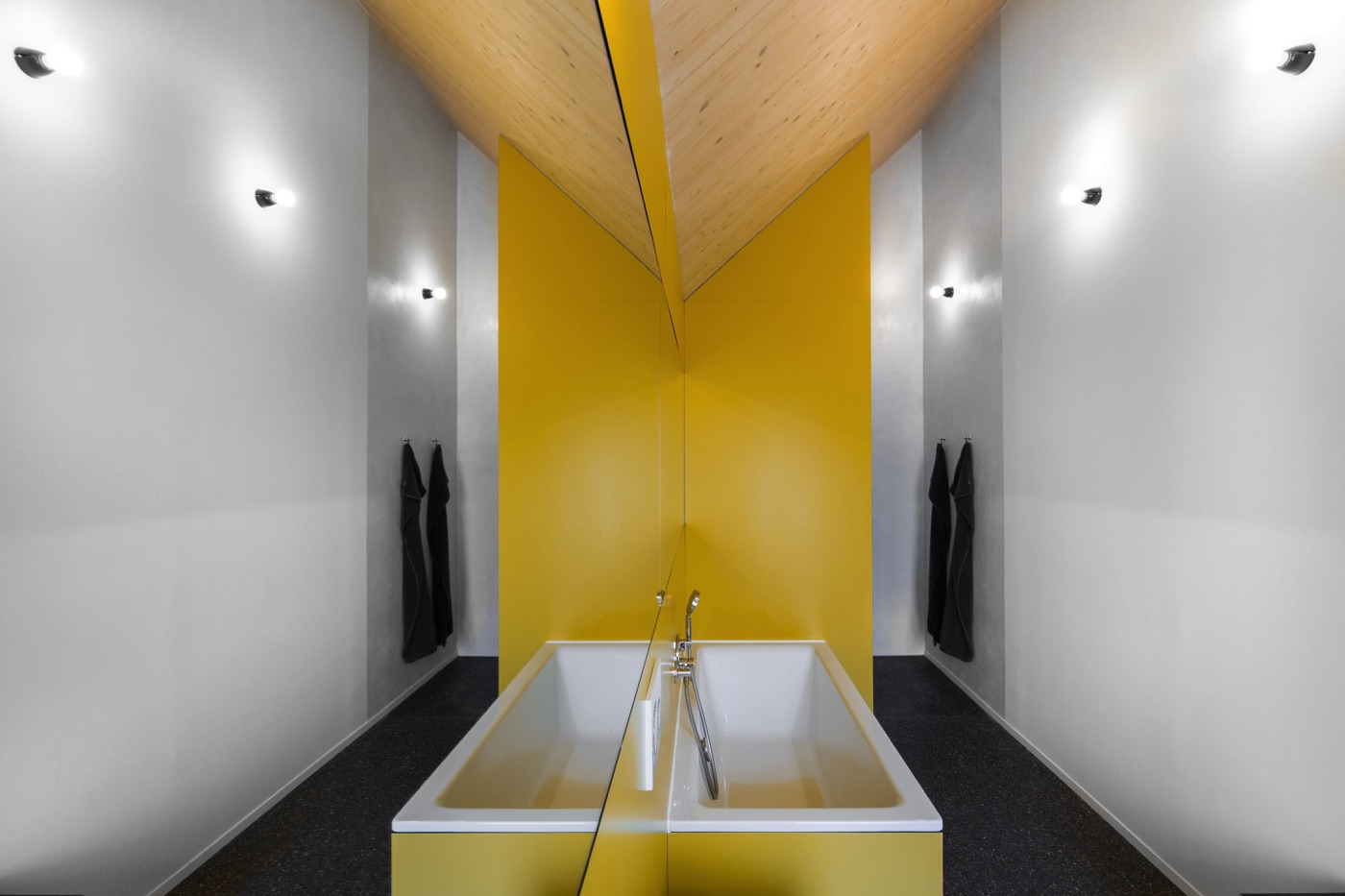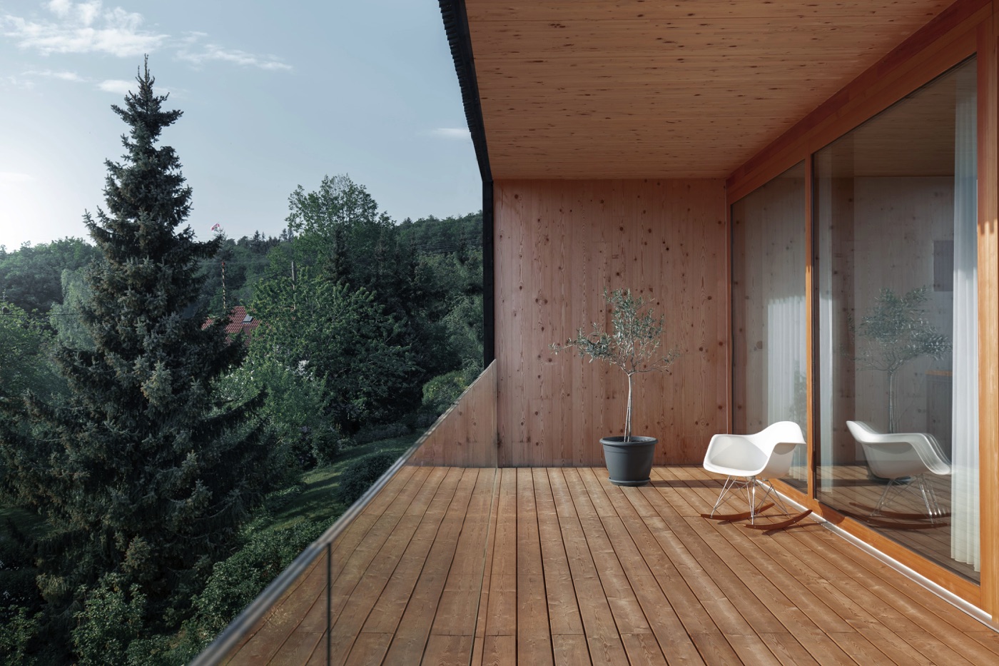 Auf der Eingangsseite des Wohnhauses im Osten durchbrechen lediglich die schmale Haustür und zwei langgestreckte Fenster die Haushülle. Richtung Westen öffnet sich das Gebäude und gibt durch bodentiefe Fenster die atemberaubende Aussicht ins Remstal frei.
