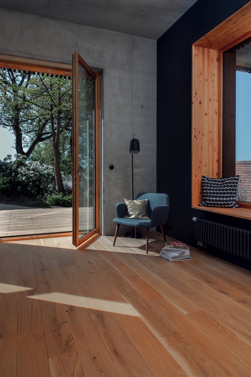 Tiefes Schwarz, kühler Sichtbeton und warmes Naturholz: Mitten im Welzheimer Wald hat Architektin Bettina Müller-Fauth ein Haus geplant, das sich in Form und Gestalt mit der Natur verbindet. Gegenüber der umliegenden Bebauung ist das Wohnhaus stark reduziert, nimmt aber das Satteldach als verbindendes Element auf. Die Farbe Schwarz steht für die Bauherrin für Ruhe und Eleganz und stärkt die Identität des Baukörpers.