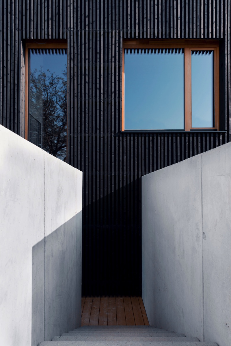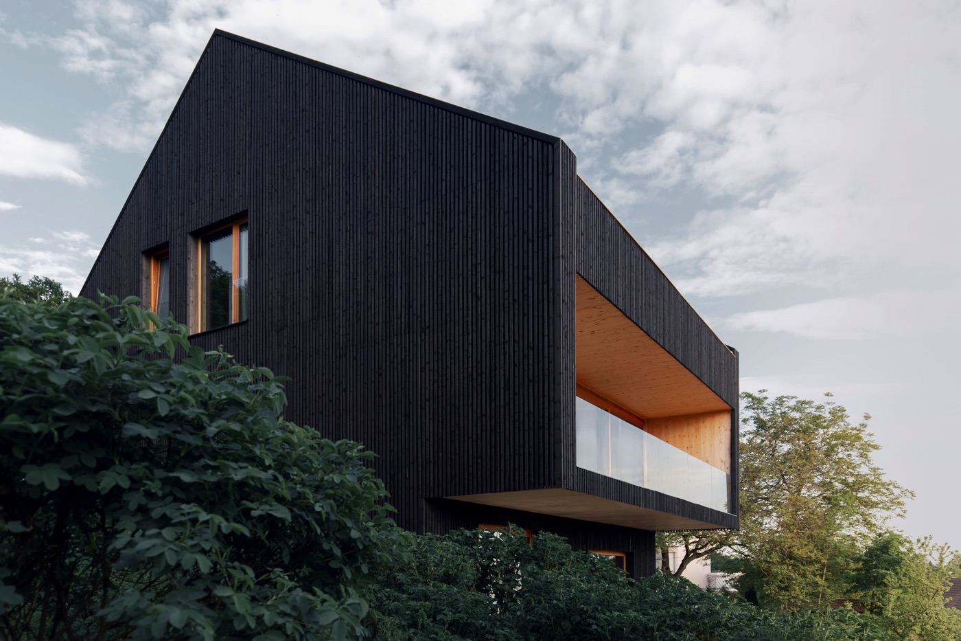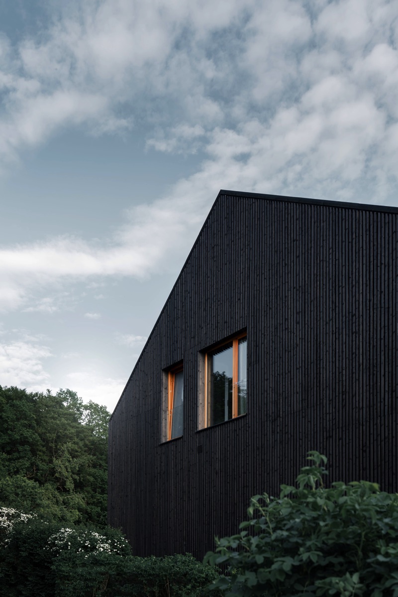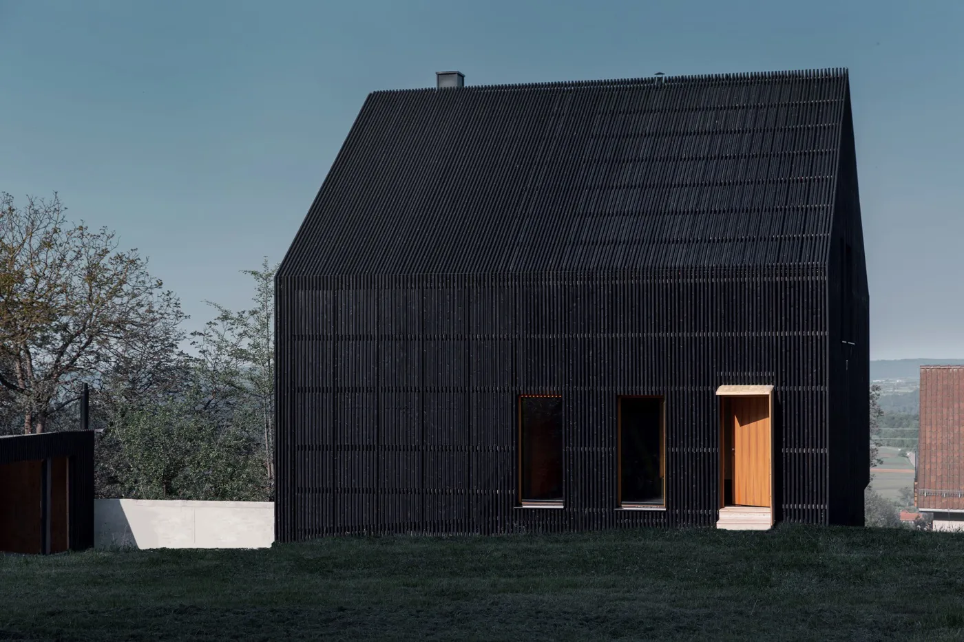 Da alle technischen Details wie Dachrinnen oder Fallrohre hinter schwarz geölten Holzstreben verschwinden, entsteht ein monolithischer Baukörper. Seine massive Wirkung wird durch die feine vertikale Strukturierung und die Transparenz der zart wirkenden Deckhölzer, die die Unterkonstruktion durchscheinen lassen, aufgehoben. So werden Fassade und Dach zu einer Einheit und das Haus mit 200 Quadratmetern Wohnfläche wird zur Skulptur in der Landschaft.