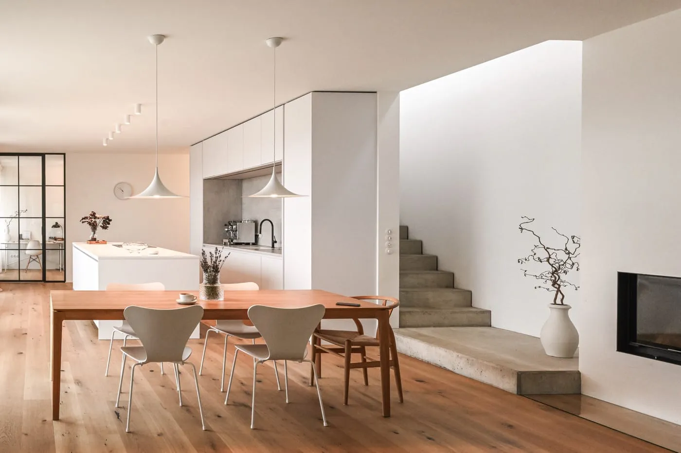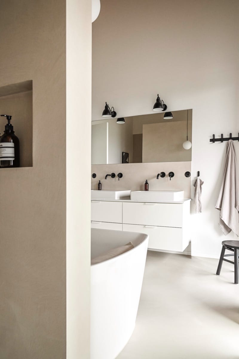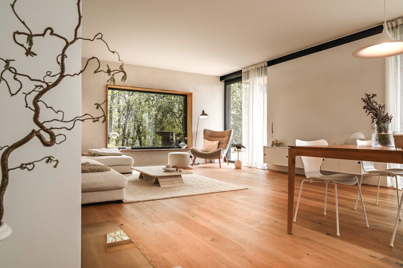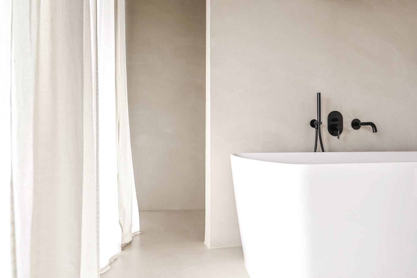 Die Innenräume sind hell und natürlich gestaltet. Weiße und beige Materialien werden geschickt von schwarzen Accessoires unterbrochen, die zur Wohnlichkeit beitragen.