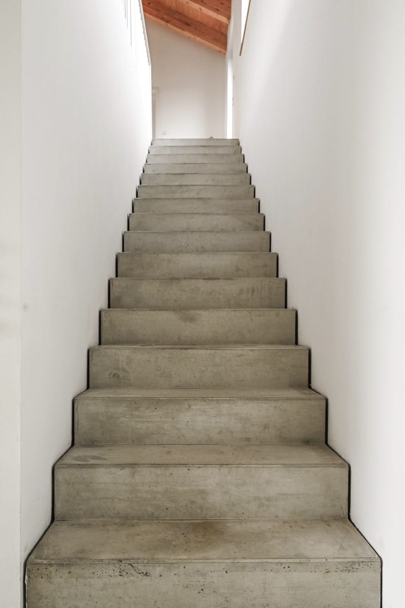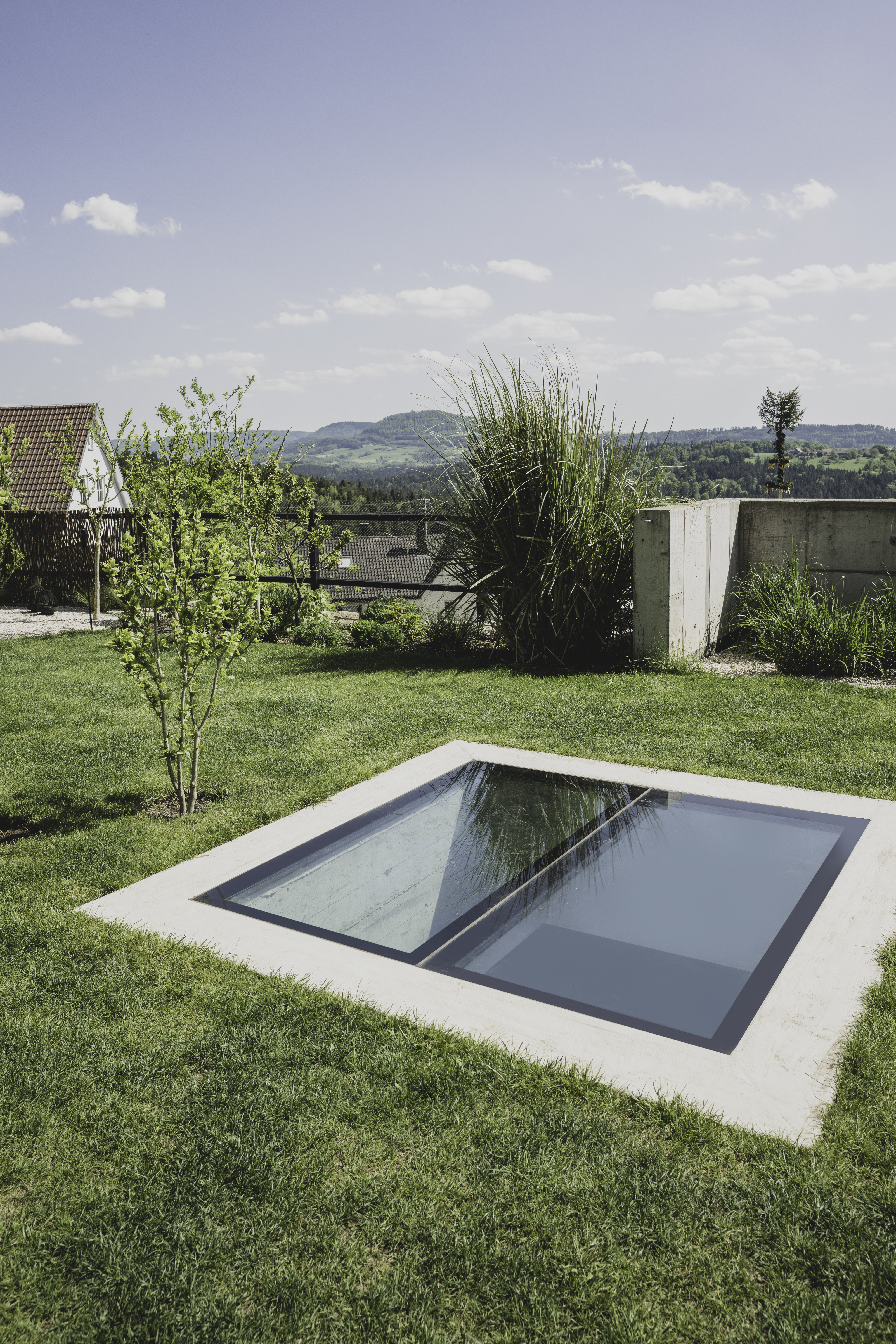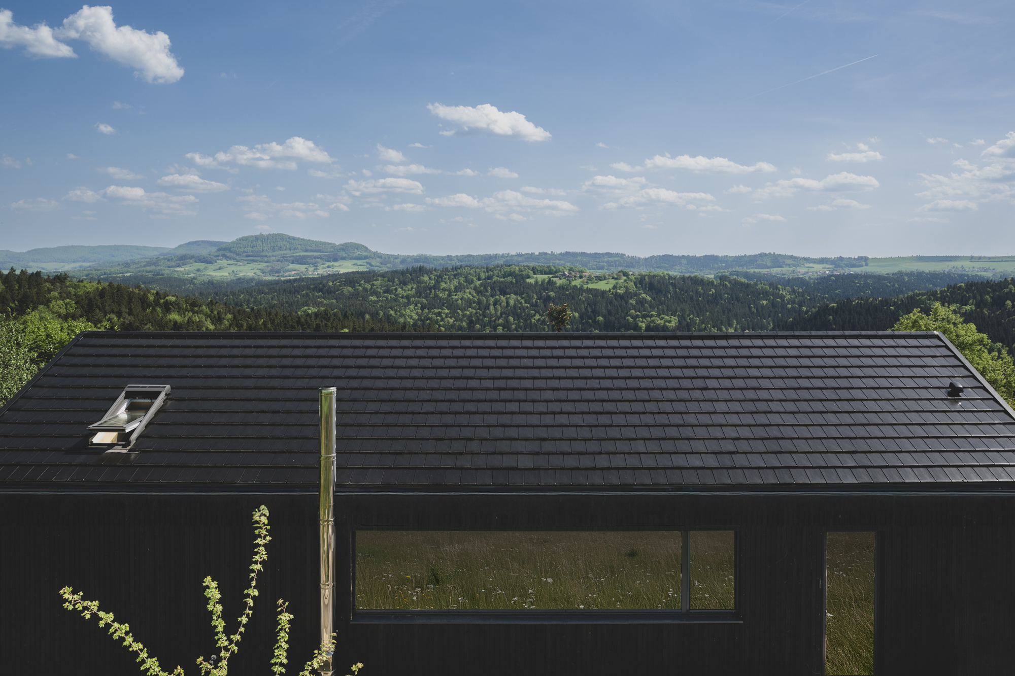 Außen schwarz, innen hell: Haus „MIHA“ spielt mit Kontrasten. Das sechs Meter breite und 17 Meter lange Gebäude in Schwäbisch Gmünd ruht auf dem steilen Grundstück im Norden - so wurde ein weitläufiger Südgarten ermöglicht. Der Zugang zum 165 Quadratmeter großen Haus erfolgt über einen unterirdischen Gang mit Lichtkuppeln, die für natürliche Helligkeit sorgen. Eine Sichtbetontreppe führt von der Garderobe im Untergeschoss ins komplett nach Süden verglaste Erdgeschoss. Die Wohnräume dort sind nach Süden orientiert und geben durch die Fenster den Blick auf die „Drei Kaiserberge“ frei. Das großzügige Sitzfenster im Osten lädt ein, den Blick ins angrenzende Biotop schweifen zu lassen.