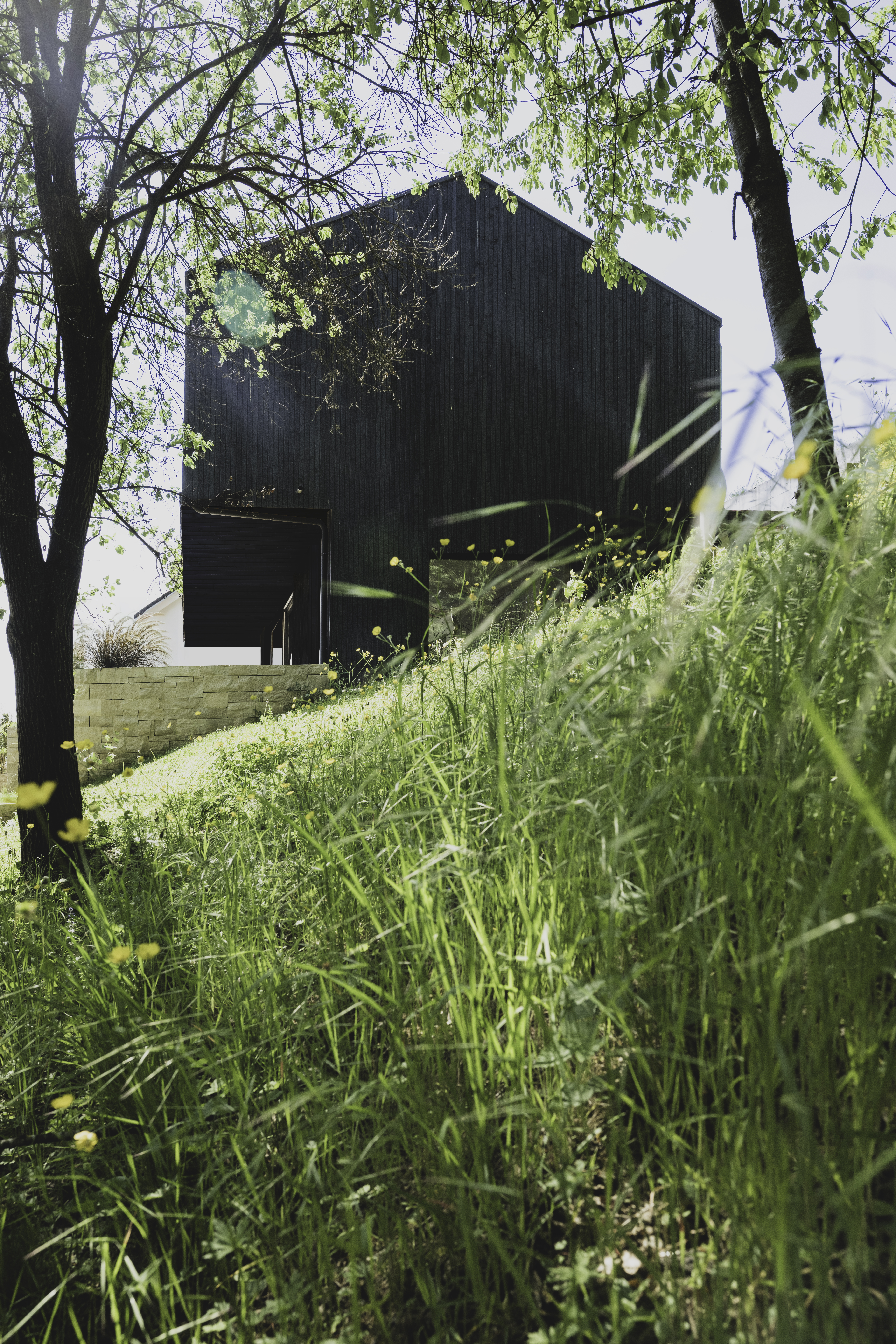 Das Einfamilienhaus mit schwarzer Holzfront und die Garage aus Sichtbeton verschmelzen auf dem Hangareal mit der Natur und fügen sich ins Ortsbild ein.