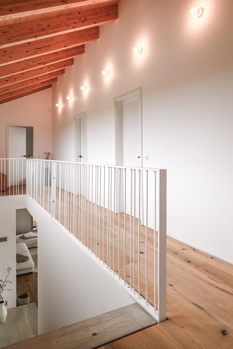 Auch im Obergeschoss sind Schlafzimmer sowie Bad Richtung Süden orientiert – eine überdachte und überhängende Loggia schließt sich an, die für natürliche Verschattung in den beiden unteren Geschossen sorgt.